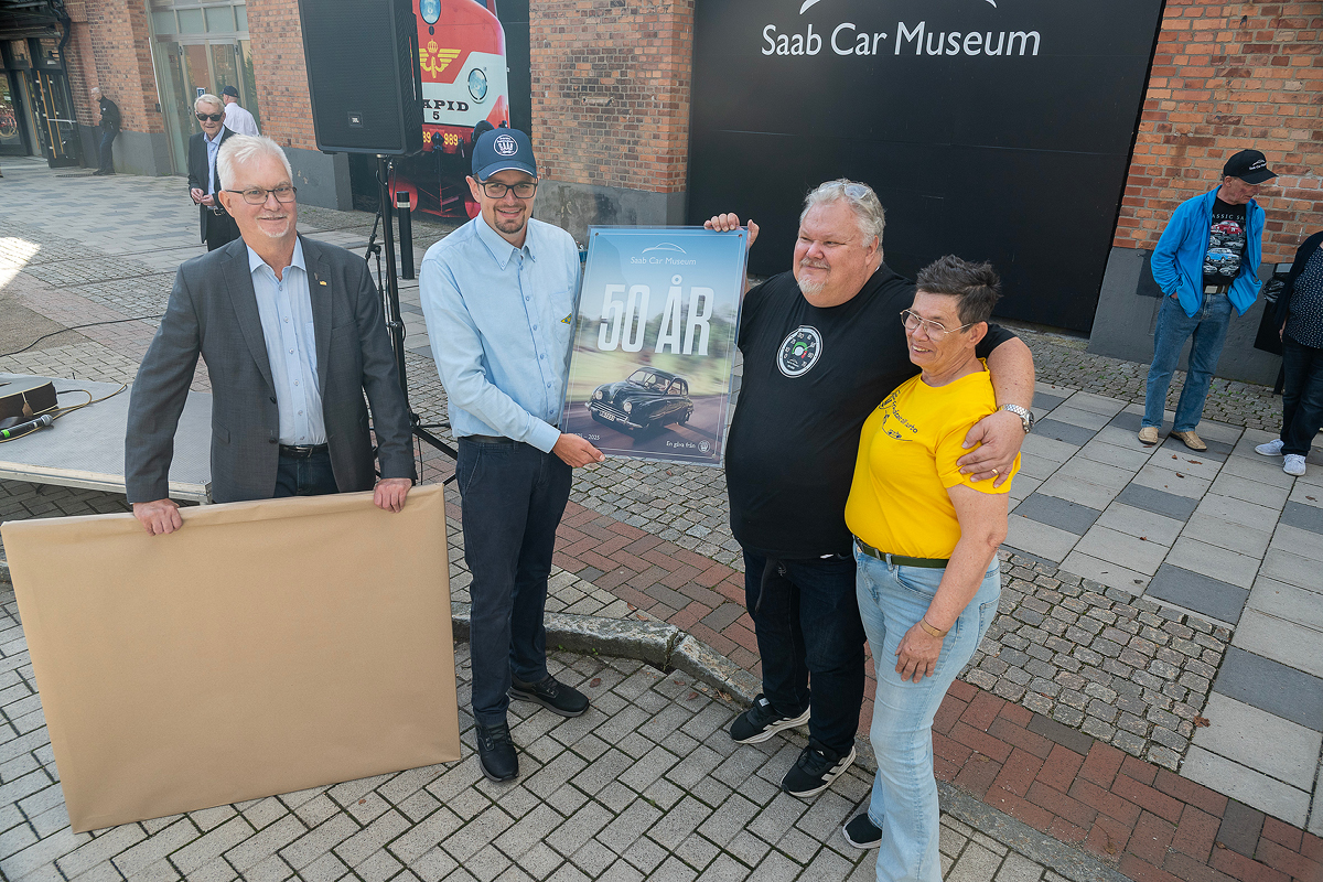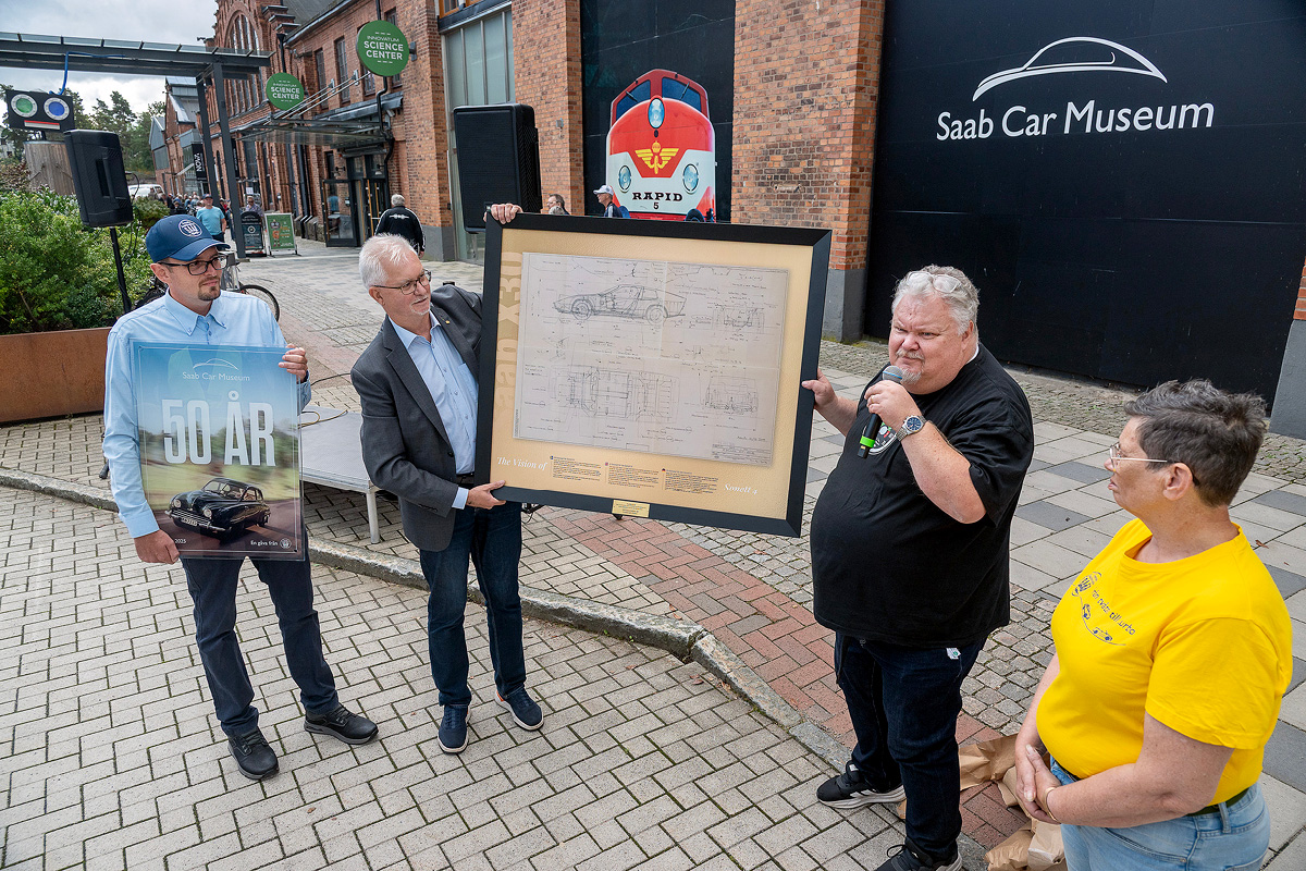 The Saab Car Museum invited everyone to a big party but tried to keep expectations at a reasonable level. Before the event, it was emphasized that this was not a regular Saab Car Museum festival, market or an ordinary car meet, but despite this, the parking spaces were quickly filled with visitors arriving in their own Saabs, and the queue to the museum was long at the opening. Guests were met by a lively fifty-year-old who had packed up with a car parade, a tour of the workshop, a photo exhibition and the start-up of unique rally and racing cars, while Nova mat och möten served anniversary "fika" and lunch in the restaurant close by.